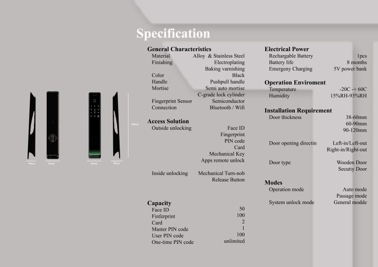 Outside unlocking | Face ID, Fingerprint, PIN code, Card, Mechanical Key, Apps remote unlock |