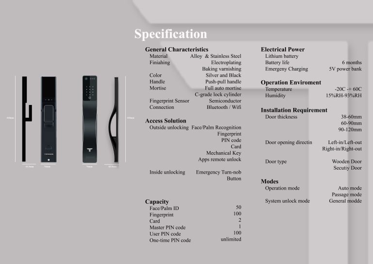 Outside unlocking | Face/Palm Recognition, Fingerprint, PIN code, Card, Mechanical Key, Apps remote unlock |