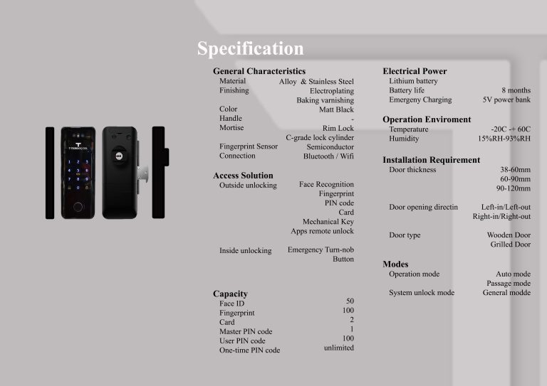Outside unlocking | Face Recognition, Fingerprint, PIN code, Card, Mechanical Key, Apps remote unlock |