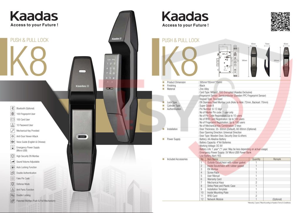 Experience the pinnacle of security and convenience with the Kaadas Push Pull Series. From fingerprint access and access cards to temporary passcodes and a dual verification security system, our system ensures controlled entry and heightened security. Rest easy with the built-in anti-pry alarm and automatic lock sensor.